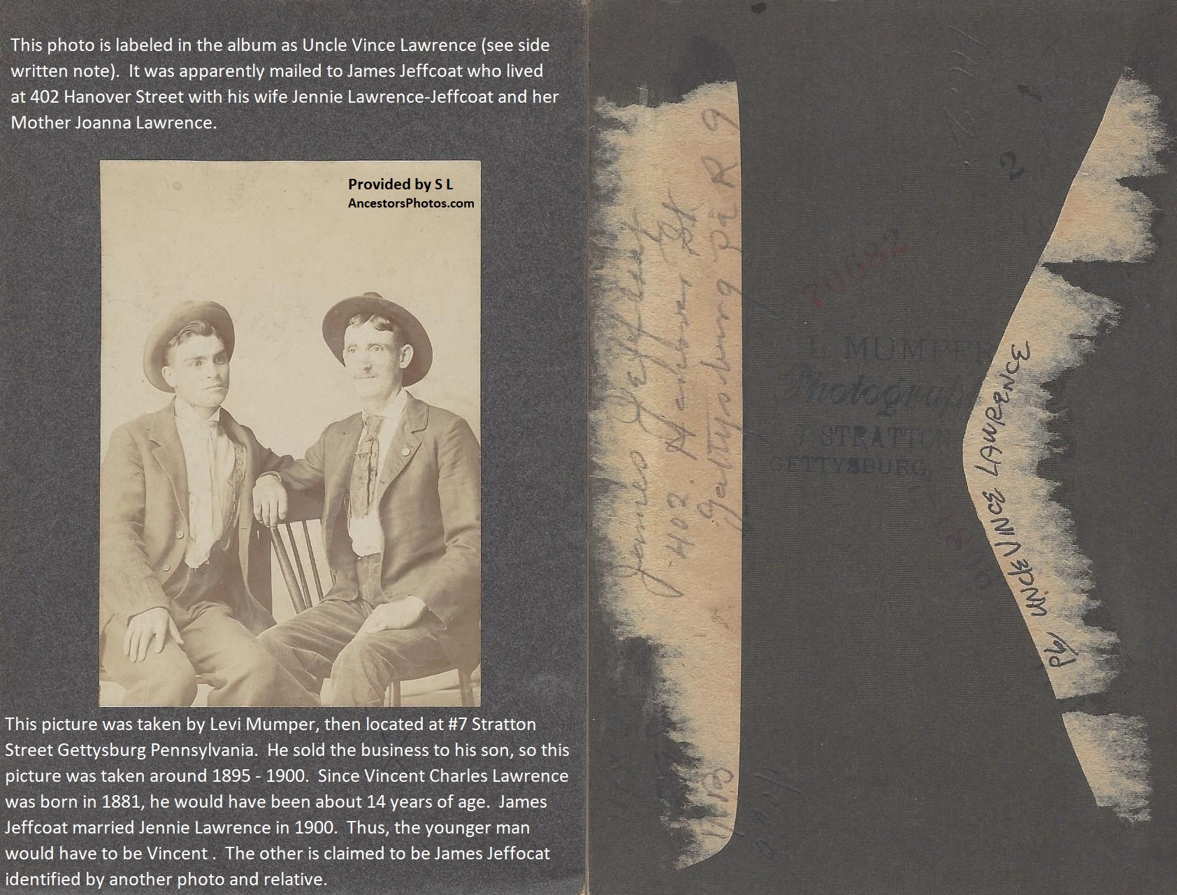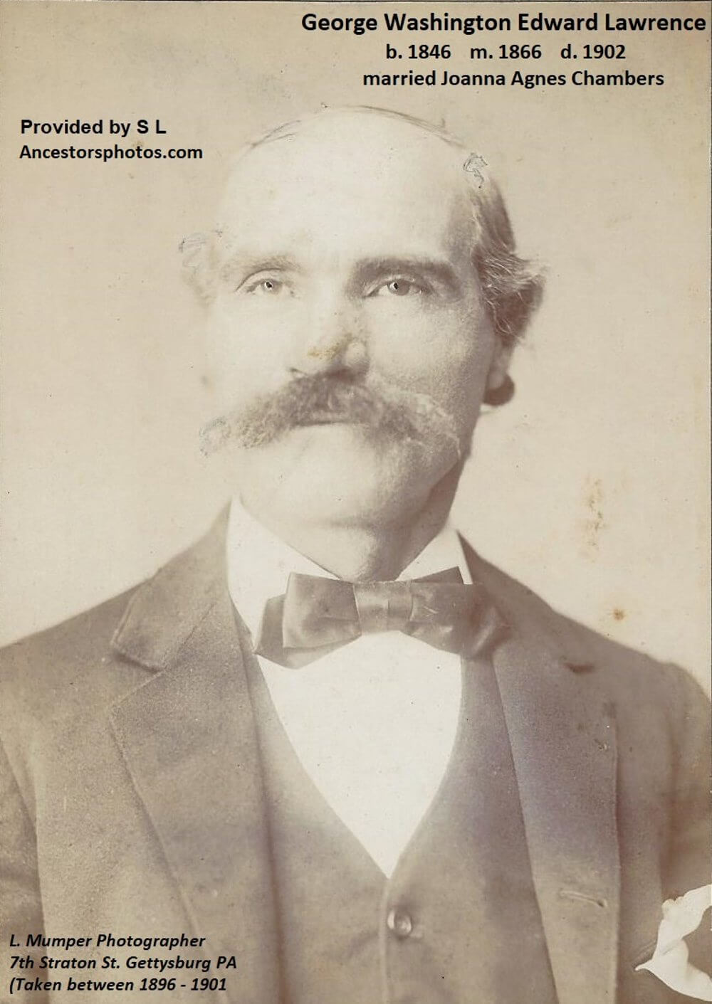 Written as Mother by her Children in George's album, indicating Laura Magdalene Lawrence-Smith. Experts say this J.I. Mumper photo is later 1880's or early 1900's.