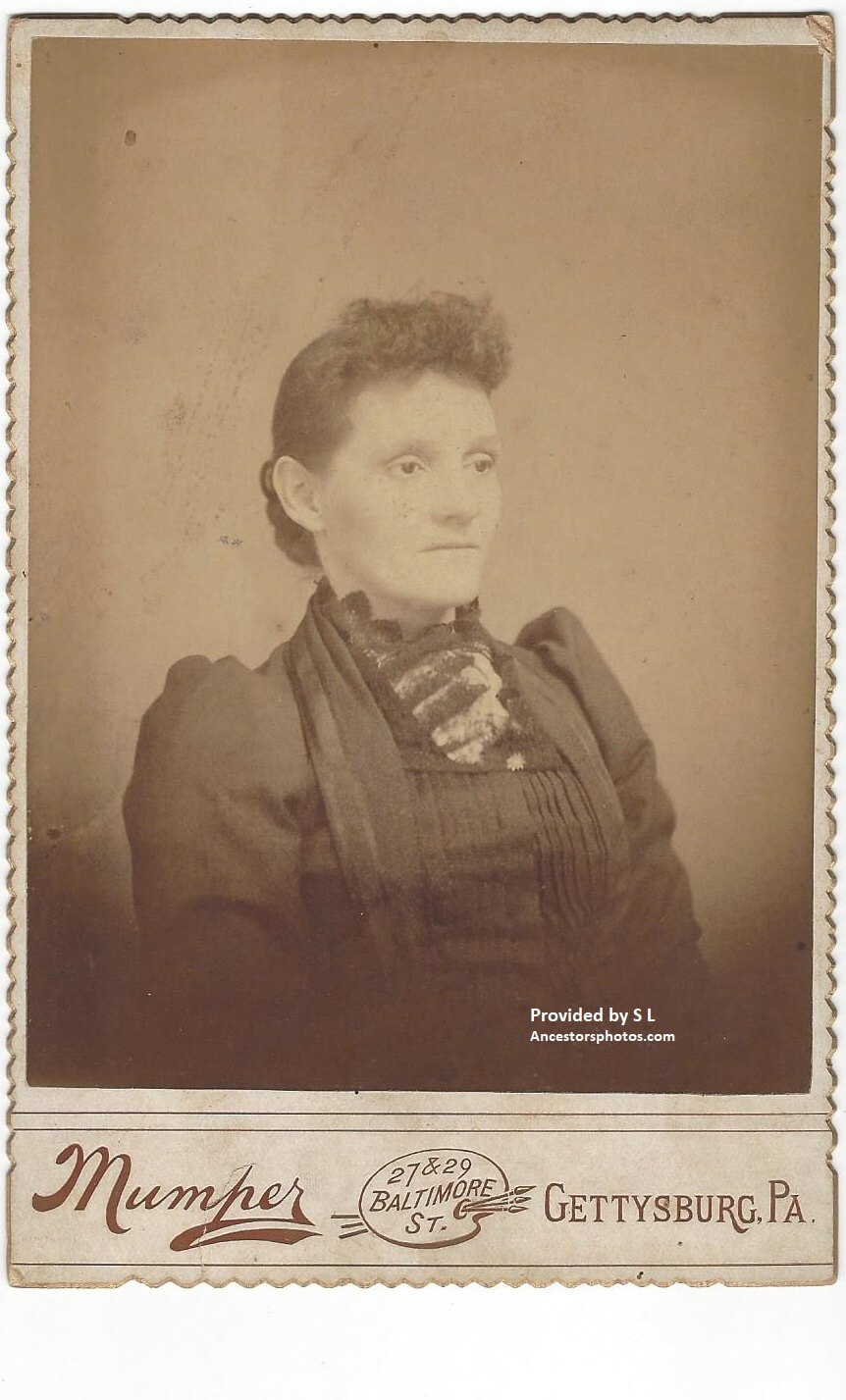 Unknown portrait of a woman by Levi Mumper sometime before 1895 when he was located at 27 & 29 Baltimore Street, Gettysburg, PA.
